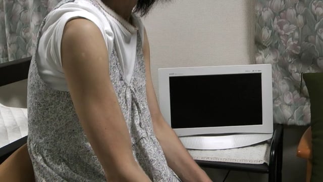 細身の女性の力こぶ動画です。チューブトレーニングの様子です。※プライバシー保護のため、顔および音声は消しております。