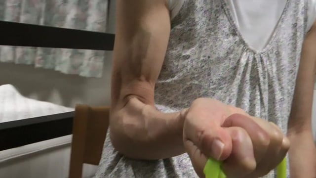 細身の女性の力こぶ動画です。チューブトレーニングの様子です。※プライバシー保護のため、顔および音声は消しております。