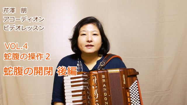 弦楽器の弓の動きのように、滑らかに蛇腹を開閉する方法を説明しています。ベローシェイクをしながら、左手をしっかりと安定させ、蛇腹の開閉の感覚をつかむ練習です。実際に練習曲を奏でながら滑らかに開閉する感覚を養います。