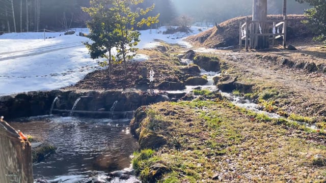神社の境内にある小さな滝 寒い冬になると水が凍り美しい姿です