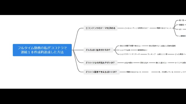 フルタイム勤務で働く私が副業を始め自分のコンテンツを作り ココナラで連続18件成約達成した方法をお伝えする動画で まず自分の商品作りのテーマを決めるためのヒントをマインドマップで動画にしてアドバイスしています。