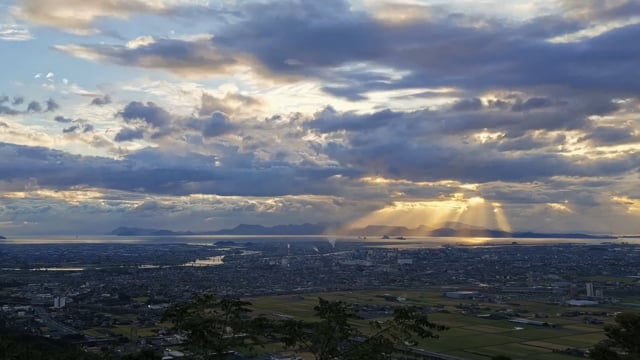 夕方、雲の切れ間から降り注ぐ夕日です。ちょっと市街地の夜景も入っています。