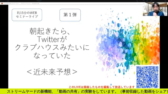 ストリームヤードに2021年の3月初め頃追加された、「あらかじめパソコンの中にある動画」を、ストリームヤードで直接、共有する。と言う機能を使って、facebookでLIVEしてみたものをダウンロードしたサンプルです。ところどころ画質や音声が乱れる場合があります。これが、Wi-Fiで行ったせいなのか?(有線LANで行わなかった)なんなのか?は、わかりませんが、現状として、サンプルとしてお届けします。