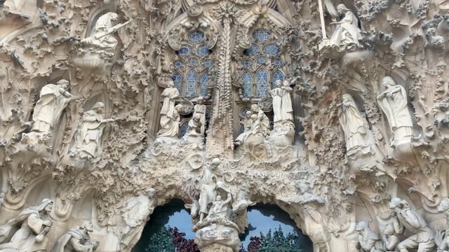 バルセロナ、天才ガウディの手掛けた傑作サグラダ・ファミリア。生誕の門の彫刻群は新約聖書の内容を語っている。Barcelona, the most famous architecture, Sagrada Familia by Antoni Gaudi. The various sculptures in the Nativity facade.