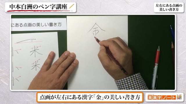 「小」や「金」など、左右に点画がある漢字は、左右の点画の起筆(書き始め)の位置が右上がりのリズムになることを意識しましょう。