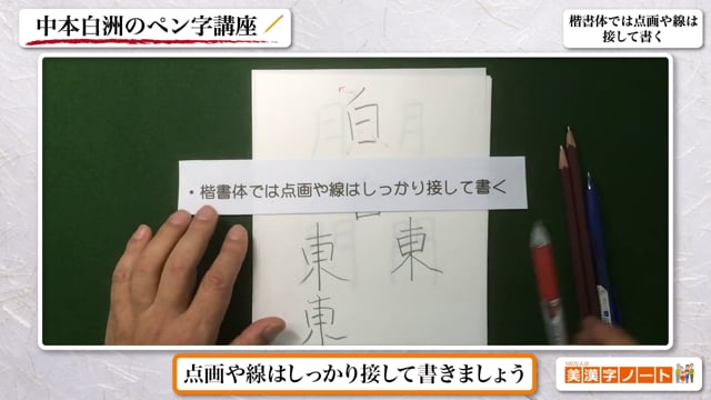 ■楷書体では点画や線を離さずに接して書く接するべき各線が離れてしまいますと、だらしない印象の文字になってしまいます。線同士をしっかり接するように書くことで、引き締まった文字になります。動画では「白」「東」「月」「門」などの漢字で説明していますので、しっかり意識付けをするようにしましょう。