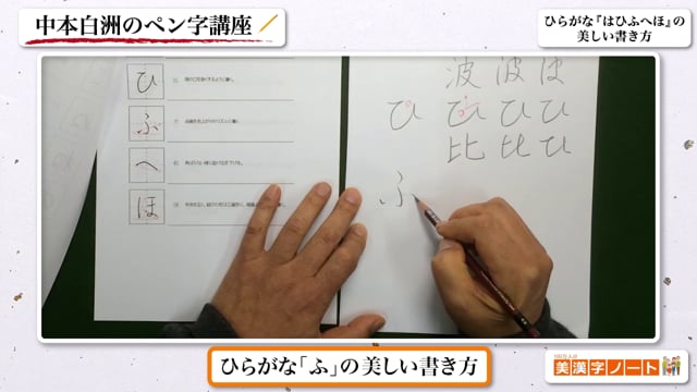 ■文章の7割を占める「ひらがな」を美しく書きましょうひらがなは日本語文章の約7割を占めると言われています。ひらがなの美しい書き方を身につけるだけで字の印象は大きく変わります。本動画では、ひらがなの『はひふへほ』を解説しています。