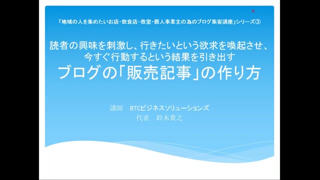 この講座を観ることで、ブログを一生懸命頑張って更新しても集客できないというお店・飲食店・教室・医院の経営者が、ブログ集客で地域の人を集めるのに最も大事な販売記事の書き方が分かるようになります。