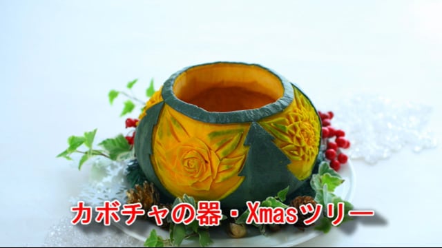 彫った後で蒸し、中にグラタンをいれて丸ごと食べたり、オアシスをいれて花器としてつかうこともできるカボチャの器です。