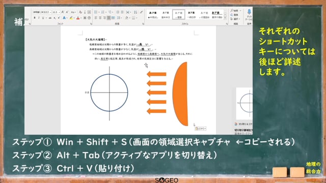 教材作成の速度向上や、GIGAスクール時代の生徒にとっても有益な、ショートカットキーの紹介です。Win + Shift + Sで画面を選択キャプチャ(スクショ)し、Alt + Tabで素早く画面を切り替え、Ctrl + Vで貼り付けることができます。↓こちらのページにも説明があります。https://chiri-so-geo.com/materials-0125/動画時間:約5分