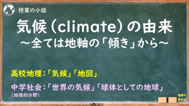 「気候」「地図(球体としての地球)」で使える小話です。地球の公転と地軸の傾きによって、気圧帯の移動が生じ、気候の年変化が起こります。ところで、気候の英単語climateの由来は……?↓こちらのページにも説明があります。https://chiri-so-geo.com/tips-0130/動画時間:約4分