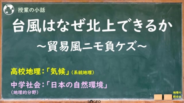 「気候(熱帯低気圧)」で使える小話です。台風は日本近海で偏西風に乗り、大きく進路を変えて襲来することは生徒も実感しています。でも、その前に貿易風が北から押さえつけるように吹くのでは……?↓こちらのページにも説明があります。https://chiri-so-geo.com/tips-0143/動画時間:約8分