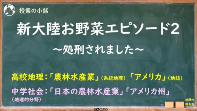 「農業」「ヨーロッパ州」「アメリカ州」で使える小話です。ヨーロッパの人々を飢えから救ってきたじゃがいもですが、最初は異端扱いされ、魔女裁判で火あぶりの刑にされたとか……。栽培を普及させるための驚くべき知恵も紹介。↓こちらのページにも説明があります。https://chiri-so-geo.com/tips-0144/動画時間:約10分