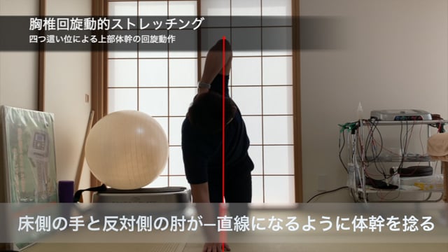 四つ這い位での胸椎回旋動的ストレッチングの動画です。肩関節の外旋動作とともに体幹の回旋動作を引き出します。ここで重要なのは、胸郭の上に乗っかる肩甲骨です。肩甲骨の動きは胸郭との連動性に著しく影響し、回旋動作のアシストに働きます。ゴルフでのスイング、投球動作などカラダを捻る動作に必要な動きです。