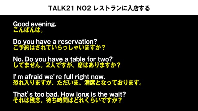 TALK2 NO2 レストランに入店する、の会話例NO2では、スローのスピードで英語と日本語を流して、リスニング力を定着させます、実際に真似して声を出してみましょう!
