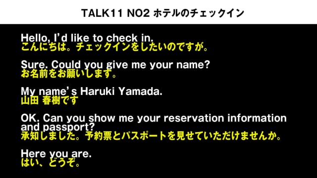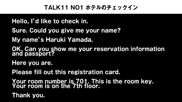 TALK11 NO2 ホテルのチェックインの会話例 NO2では、スローのスピードで英語と日本語を流して、リスニング力を定着させます、 実際に真似して声を出してみましょう!