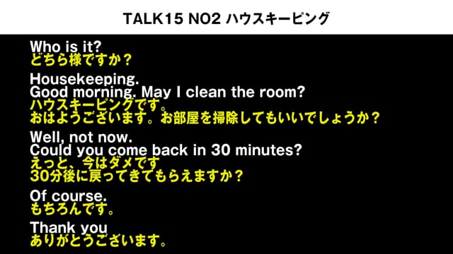 TALK15 NO2 ハウスキーピングの会話例 NO2では、スローのスピードで英語と日本語を流して、リスニング力を定着させます、 実際に真似して声を出してみましょう!