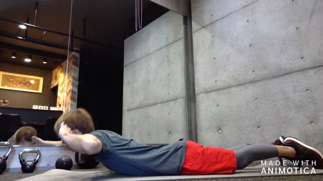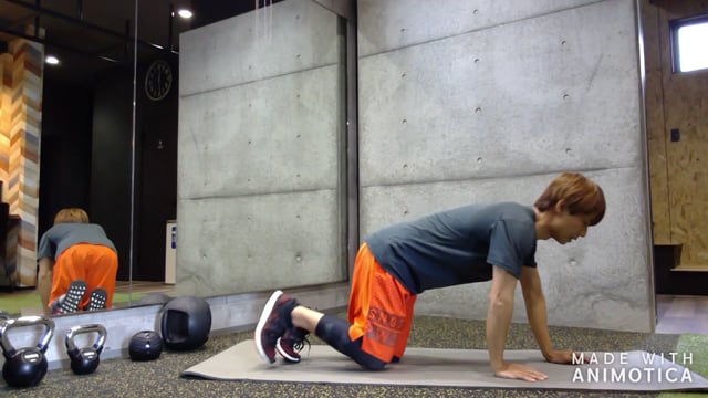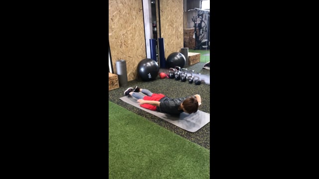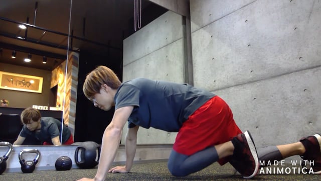 体幹部とお尻・もも裏のトレーニングです。お腹の力が抜けないように意識して行いましょう。太ももを上下させるようにし、高く上げすぎない程度で行いましょう。高く上げようとすると腰が反る原因になります。余裕がある方は、オプションとして脚と反対側の腕を持ち上げてみて下さい。より体幹部への刺激が高まります。