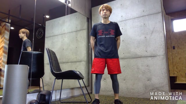 片脚での高強度のトレーニングになるので、壁など支えになるものの近くで最初は行ってみてください。前の脚の位置が椅子に近すぎると、窮屈になって膝が前に出やすくなるので注意しましょう。股関節の付け根の部分が押し込まれるようにしながらお尻を落とします。後ろの脚に体重が乗らないように気をつけてください。