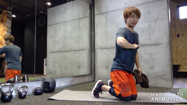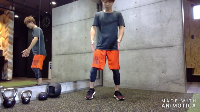 よくお尻のトレーニングとしても掲載されることが多いですが、人それぞれの股関節の可動域があるので、開きすぎてお尻を落とした時に膝が内側に倒れないように気を付けて下さい。膝の位置がなるべく動かない脚幅で行いましょう。脚の付け根を少し引き込むようにしながらお尻を落として、ボトムでもも裏・内もも・お尻にストレッチ感がでるようにしましょう!