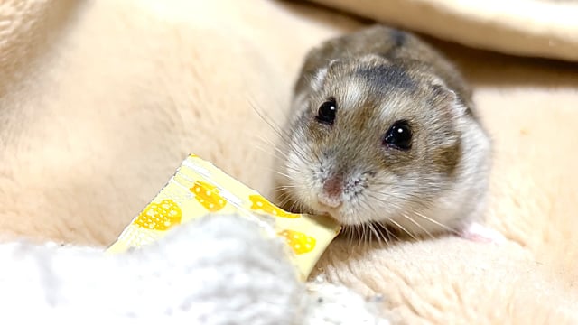 チュールを食べるかわいらしいジャンガリアンハムスターの動画素材です♪