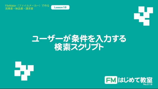 FileMaker(ファイルメーカー)で作る見積書・納品書・請求書作成 18/27回です。今回は、ユーザーがメインメニューにあるフィールドに条件を入力しそれを取得して、検索を行うためのスクリプトについて解説しています。