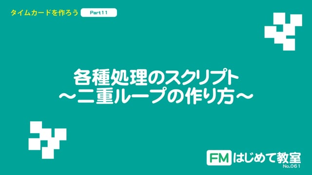今回のテーマは、各種処理のスクリプトです。タイムカードのレコード作成スクリプトや、集計、再集計のスクリプトを作成していきます。集計、再集計のスクリプトは、すでに作成していますが、メインメニューから、作動するように一部を修正していきます。タイムカードのレコード作成のスクリプトは、Loopが二重になっている複雑な処理を学ぶことができます。