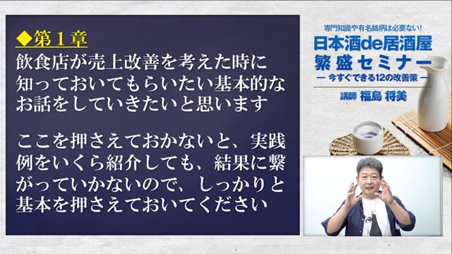【ふくまる式日本酒活用術】 20年間培った居酒屋経営のマル秘ノウハウを60分にギュッとまとめました 時間の無いあなたにピッタリのマル秘動画です ☆この動画のポイント ◼️有名銘柄や日本酒の特別な知識は全く必要ありませんし覚える必要もありません ◼️早ければ今すぐ実践できて翌日には結果が現れるものも含まれています ◼️この動画は12個の具体的な事例を公開するだけでなく、その12個の事例を1番~12番まで取り組む順番もお伝えします ◼️なぜ取り組む順番が必要なのか?実はそこが1番重要なのです! ◼️取り組む順番を間違うと、どんなに手間暇かけて集めたお客様も、ザルで水を掬うかの如くどこかに消えていきます ◼️どんなに素晴らしいノウハウも取り組む順番1つで全く別の結果が現れてしまいます ◼️この動画では12個のマル秘ノウハウを1つあたり1000円以下で販売しています ◼️しかも分かりやすく取り組む順番と具体例を添えております ~最後に~ この飲食業界に於いて20年商売を続けている人は『1%』と言われています 100人に1人の狭き門の扉を開けるのは、才能やセンスなんかじゃありません 20年商売を続けれるノウハウを知るか知らないかの違いです あとはそれを実践するかどうかをあなたが決めるのだけなのです きっと道はあります その道の先にあなたの目指す未来があります