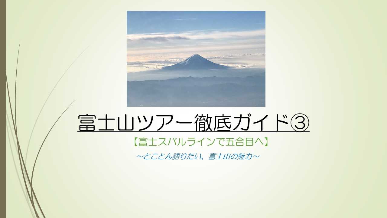 第3回のこちらのビデオでは、富士スバルラインを使い富士山麓から五合目までのルートを、バーチャルツアーのようにご案内します。ルートに沿ったガイディングポイントをはじめ、登山、歴史、名前の由来、高さの簡単な覚え方…etc、富士山のさまざまな情報を分かりやすくまとめました。英語での実際のガイディング・デモも交えながら、すぐに使える実践的な内容となっております。 富士山ツアーは初めてという初心者の方、経験はあるもののあまり得意ではないという方、あるいはなかなか下見に行けないという地方在住の方、あるいは単に他のガイドの富士山ツアーの様子を覗いてみたいという方まで、どうぞお気軽にご覧になってみてください!