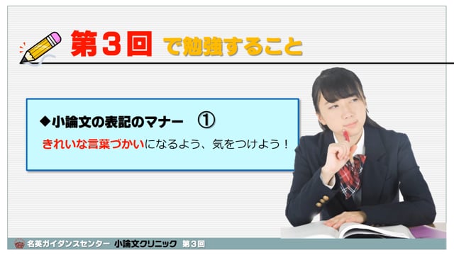 超初心者のための小論文講座です。第3回は、小論文の表記のマナー①。普段使っている言葉を小論文向けにする練習です。3つのキーワードを覚えて、小論文らしい表記にしましょう。スマートフォンで視聴する場合、通信料制限にご注意ください。できればWi-Fiで視聴することをお薦めします。