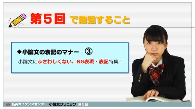 超初心者のための小論文講座です。第5回は、小論文の表記のマナー③。小論文にふさわしくない表記や表現を集中的に学びます。この回には「スマホで小論文添削」課題が付いています。スマートフォンで視聴する場合、通信料制限にご注意ください。できればWi-Fiで視聴することをお薦めします。
