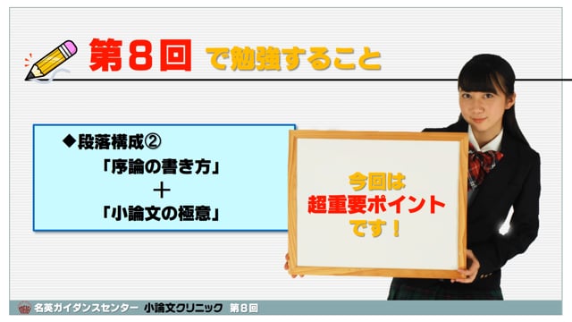 超初心者のための小論文講座です。第8回は、「段落構成②」として、序論の書き方の勉強です。さらに「小論文でもっとも大切な3つの心得」も学びます!必見の回です。スマートフォンで視聴する場合、通信料制限にご注意ください。できればWi-Fiで視聴することをお薦めします。