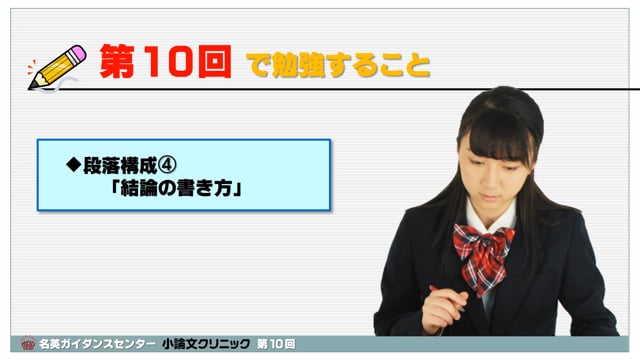 超初心者のための小論文講座です。第10回は、「段落構成④」として、結論の書き方の勉強です。最後まで気を抜かず、しっかりまとめましょう。この回には「スマホで小論文添削」課題が付いています。スマートフォンで視聴する場合、通信料制限にご注意ください。できればWi-Fiで視聴することをお薦めします。