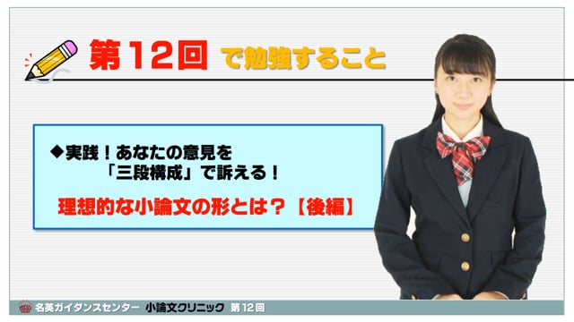 超初心者のための小論文講座です。第12回は、「理想的な小論文の形」後編。高校生に身近な話題で、意見を三段構成で組み立ててみた前回の仕上げです。完成型を見てみましょう。スマートフォンで視聴する場合、通信料制限にご注意ください。できればWi-Fiで視聴することをお薦めします。