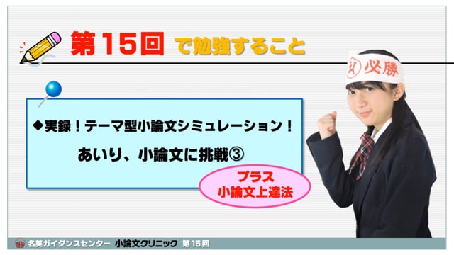 超初心者のための小論文講座です。最終回の第15回は、具体的な設計図の作り方と、入試での時間の使い方、普段からの小論文勉強法などを教えます。この回には「スマホで小論文添削」課題が付いています。スマートフォンで視聴する場合、通信料制限にご注意ください。できればWi-Fiで視聴することをお薦めします。
