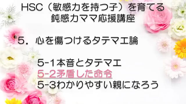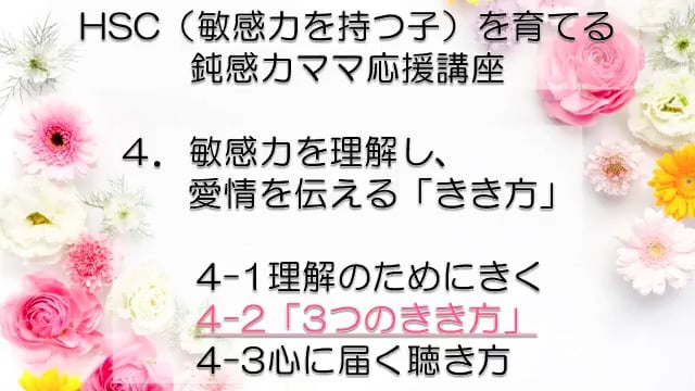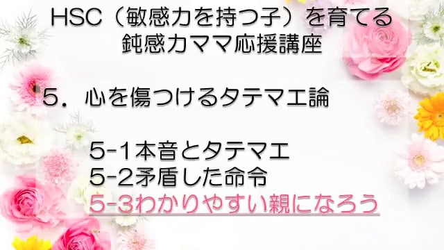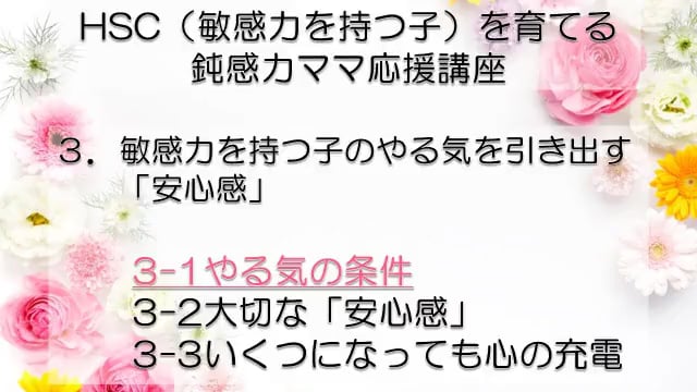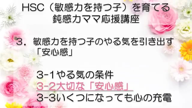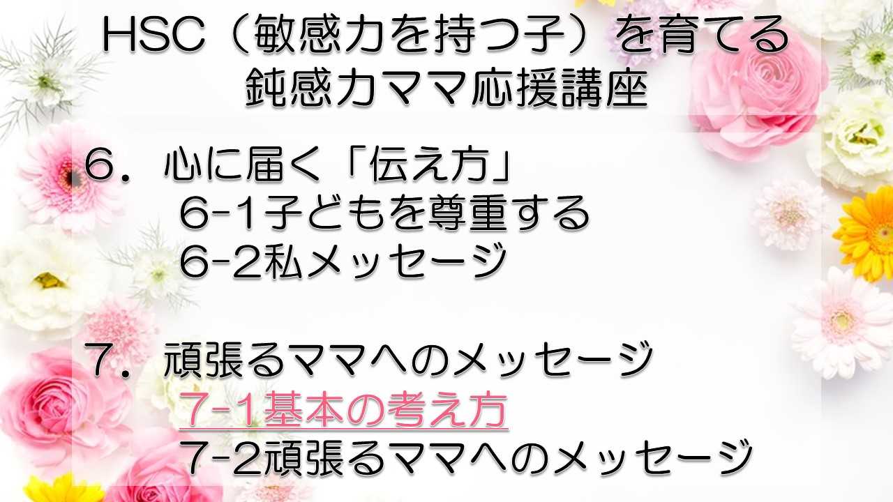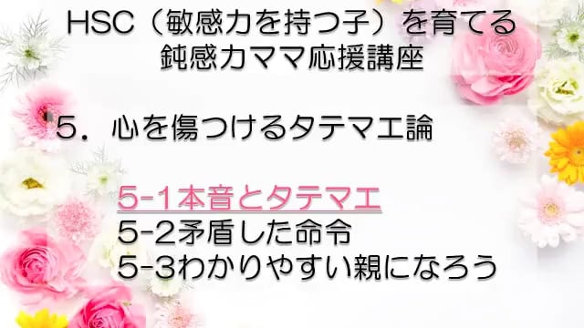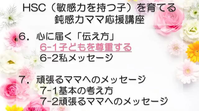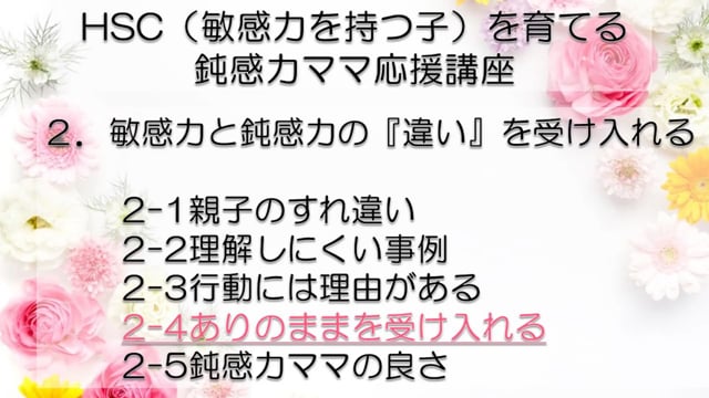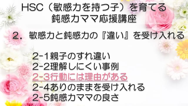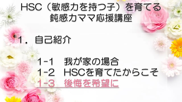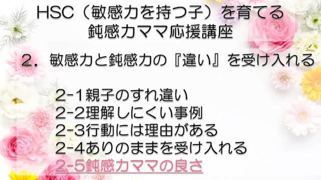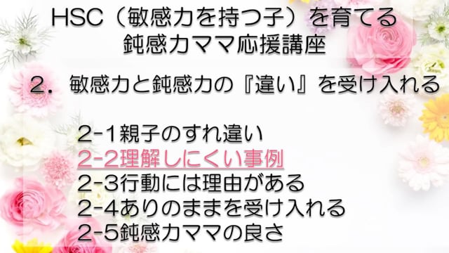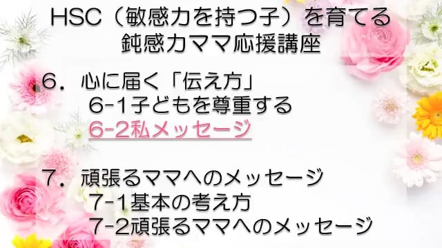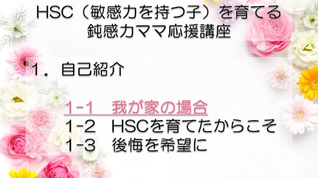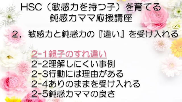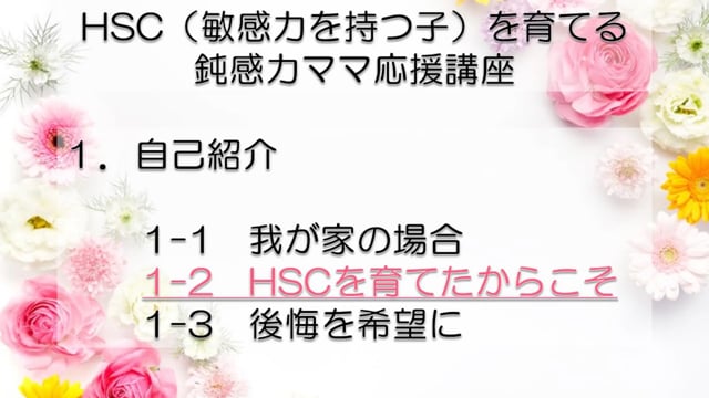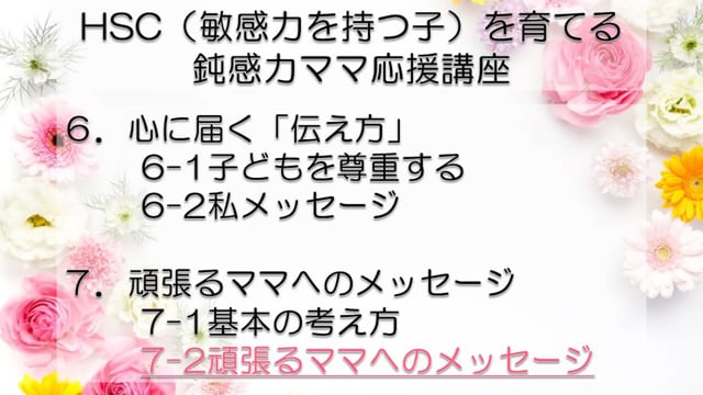 この講座では、鈍感力を持つママが、自分とは違う敏感力を持つ子HSC(Highly Sensitive Child)を育てるうえで特に大切なポイントをお伝えしています。 感受性の違いからお互いが理解できず、会話もできなかった私たち親子が、人からうらやましいといわれるほどの仲良し親子になれた理由がわかります。 どうぞあなたの子育てに、私たち親子の経験を役立ててくださいね! まずは全体の目次をご紹介します。 敏感力を活かす子育てサポーター コミュニケーション・サポーター 会話の泉 事務局長 横山 由紀子 HSC(Highly Sensitive Child)についての詳細は、 「鈍感力ママの私にもできた!敏感力をもつ子(HSC)と楽しく生きるコツ! 」ホームページ https://kaiwanoizumi.boo.jp/HSC/ 横山の経歴については 「会話の泉」ホームページ https://kaiwanoizumi.boo.jp/ をご覧ください。 【ご注意ください】 ※1か月見放題コースを選択すると、受講契約は毎月自動更新されます。 解約するまで毎月受講料がかかりますので、ご注意ください。 解約の場合は、FILMUY公式オンライン講座サイトにログインし、ACCOUNTページ「視聴中の動画」一覧より解約ボタンを押してください。 ※動画の録画・無断転載はお断りしております。