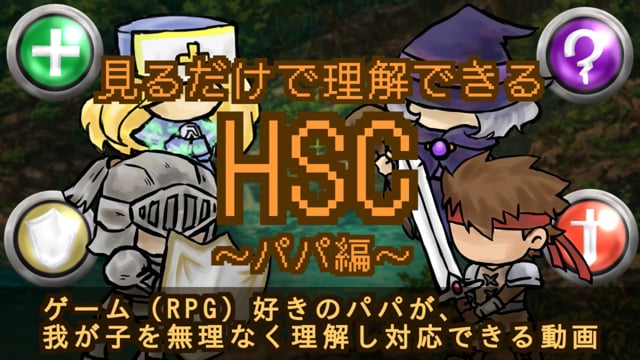 ◆動画について◆ 忙しいパパ必見の動画ができました。 電車移動やちょっとした空き時間に、スマホで何度でも視聴できます。 「HSCに関する本を読んでも、ピンと来なくて…」というパパも大丈夫! HSCの理解に大切なポイントを、RPG(ゲーム)に例えて説明します。 たった30分の動画を見るだけで、HSC対応のコツがわかりますよ! パパの理解と協力が欲しいママ!ぜひパパに勧めてくださいね。 身内より他人の言葉の方が素直に聞けたりしますから…。 ◆特徴と効果◆ ①「見て」「聞く」動画だから、わかりやすい 理論派も、感覚派も納得の動画で、HSCの正しい知識を身につけよう! ②家族間に起こる「感覚のズレ」に気づく せっかくの善意の言動が、HSCには裏目に出てしまう理由はコレ! ③子育てに自信がつく HSCとの正しい接し方がわかれば、積極的に子育てに関わるようになり、ママも笑顔! ④子どものお手本になる 違いを超えて認め合う両親の姿から、子どもたちは自然と学び成長する! ◆動画の目次◆ 1. HSC子育てあるある 2. HSCとは? 3. HSCの特徴 4. 気質の違い 5. 4つのタイプ分け 6. 強みを探す 7. HSCを受け入れる 8. 理解を示す行動