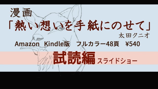 もつれた神経がほどかれるようなひとときを。 漫画 「熱い想いを手紙にのせて」太田クニオ (Kindle版 フルカラー48頁 ¥540) 食いしん坊の雄ヤギ”ガウル”は、隣の牧場の”ミディ”に恋をした。 郵便配達員のニックの協力を得て、その想いを手紙に託した――。 前2作品とは異なり、物語の根底に深い思いは無く純粋な娯楽漫画です。 *この作品の発想のベースには、童謡「やぎさんゆうびん」(曲/團伊玖雄 詞/まど・みちお)があります。 「やぎさんゆうびん」の世界観に触発されて物語を膨らませました。 個人サイト / (Jimdo) 太田クニオの娯楽漫画 https://ota-kunio-manga.jimdosite.com/