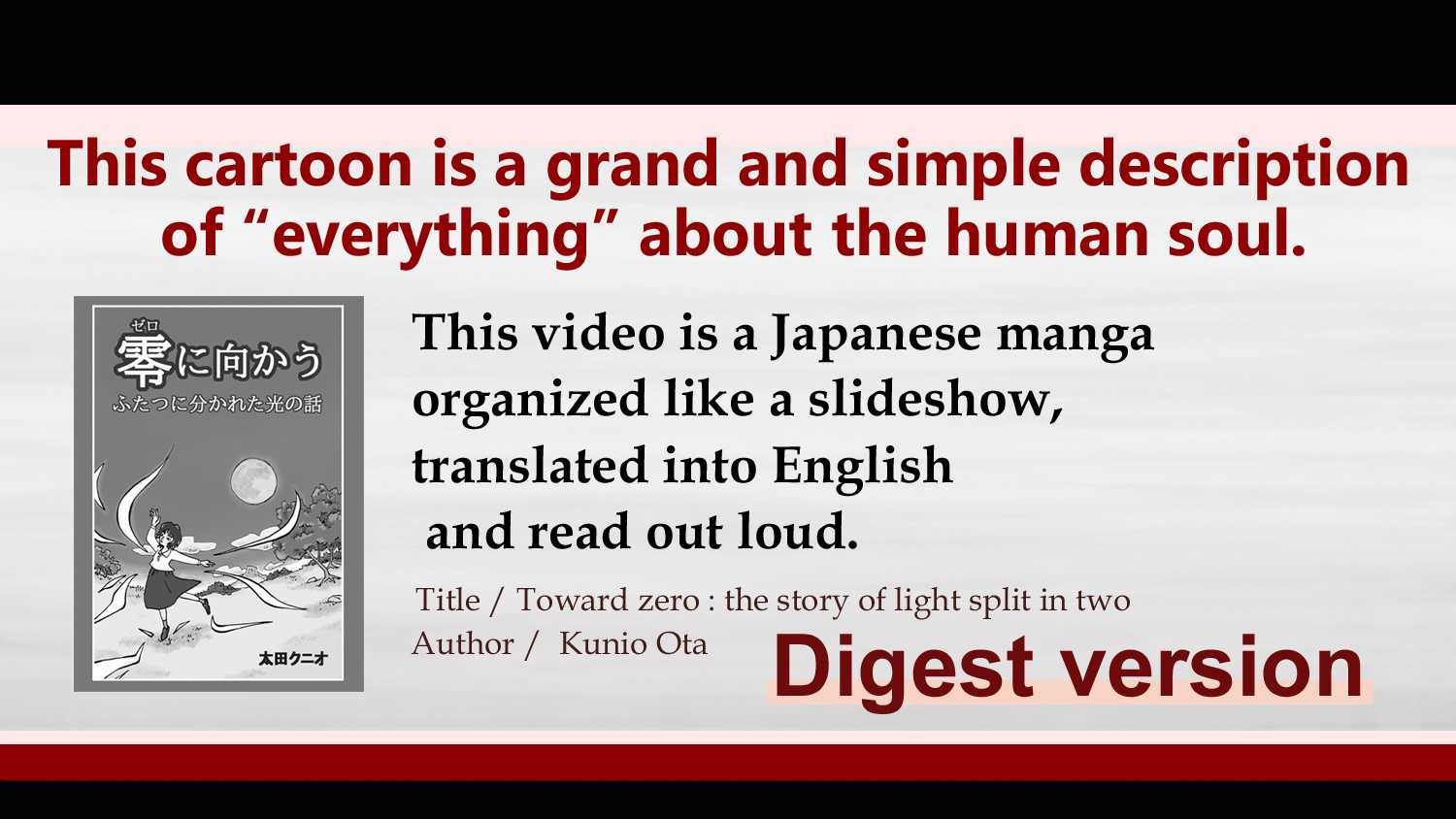 This video is a Japanese manga organized like a slideshow, translated into English and read out loud. This is an easygoing manga that describes “everything” about the human soul in a grand and simple way. Original Manga / "Toward zero : the story of light split in two" (Author Kunio Ota) [Amazon Kindle edition] この動画は、日本の漫画をスライドショーのように編成して、英訳し読み上げたものです。 人間の魂の"すべて"を壮大かつシンプルに書き表した娯楽漫画です。   元の漫画 / 「零に向かう:ふたつに分かれた光の話」太田クニオ ( Amazon Kindle版 )