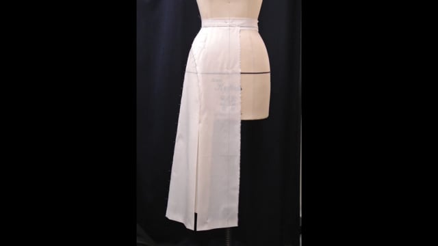 デザイン切替の入ったプリーツスカートで、切替線へのダーツ移動の原理やアイロンワークを前提としたパターンの展開手法を学習します。スカート原型から展開し、工業用パターン(縫い代付)までを学習します。