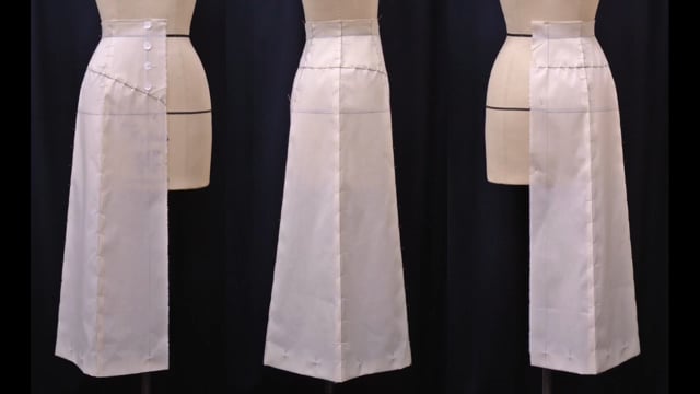 ハイウエストでヨーク切替の入ったスカートで、ヨークへのダーツ移動の原理やハイウエストの作成方法とその際のアイロンワークとパターンの展開手法を学習します。スカート原型から展開し、工業用パターン(縫い代付)までを学習します。