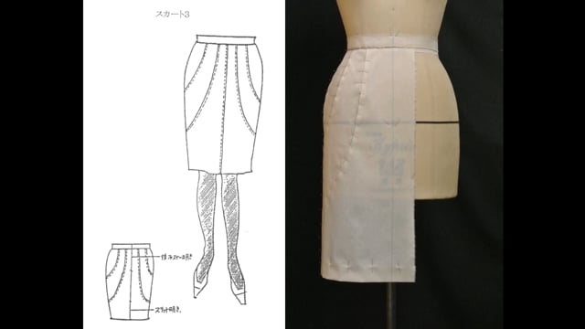 スカート原型からの変形で、デザイン切替の中にダーツを移動する手法と見え方、裏地の作成と工業用パターンまでを学習します。