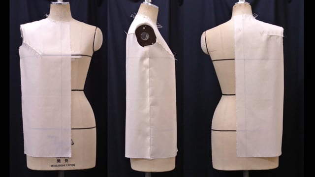 工業用ボディーに対する身頃の原型(ストレートスローパー)を立体裁断により正確に作成する工程を解説しています。完成した原型は両方の身頃をつくってモデルに着せ付けて補正する事で個人の体形に合わせた原型を作る事も出来ます。*レンタル特権としてPDFで身頃原型作成のオリジナルテキストがダウンロードできます。