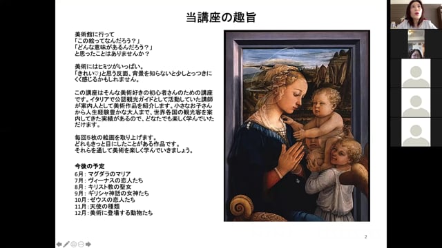 西洋美術で必ず目にする聖母マリア。 優しい眼差しに秘められた「物語」を知って、鑑賞を楽しみましょう♪ 取り上げる作品: ・受胎告知 ・聖母子像 ・ピエタ ・聖母被昇天 ・無原罪の御宿り 美術館に行って 「この絵ってなんだろう?」 「どんな意味があるんだろう?」 と思ったことはありませんか? 美術にはヒミツがいっぱい。 「きれい♡」と思う反面、背景を知らないと少しとっつきにくく感じるかもしれません。 この講座はそんな美術好きの初心者さんのための講座です。 イタリアで公認観光ガイドとして活動していた講師が案内人として美術作品を紹介します。 小さなお子さんから人生経験豊かな大人まで、世界各国の観光客を案内してきた実績があるので、どなたでも楽しく学んでいただけます。