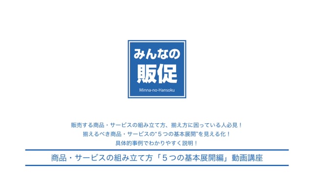 「みんなの販促」では、商品サービスの組み立て方「5つの基本展開編」動画講座をストリーミング配信中!商品・サービスの5つの基本展開をもっと具体的に知りたい方は、商品サービスの組み立て方「5つの基本展開編」動画講座をぜひご覧ください!