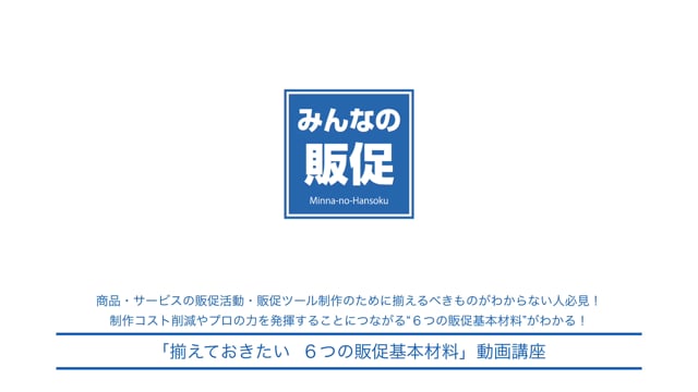 「みんなの販促」では、販促活動・販促ツールに取り組む前に揃えておきたい 6つの販促基本材料をわかりやすく解説した、「揃えておきたい 6つの販促基本材料」動画講座をストリーミング配信中!販促活動・販促ツールに取り組む前に揃えておきたい 6つの販促基本材料についてもっと具体的に知りたい方は、「揃えておきたい 6つの販促基本材料」動画講座をぜひご覧ください!