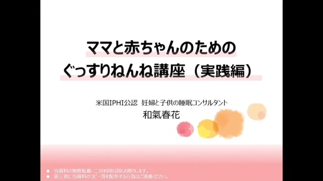 夜泣き・寝かしつけなど赤ちゃんの睡眠にお悩みの方へ。 国際認定資格保持、米国IPHI公認乳幼児睡眠コンサルタントが赤ちゃんのねんねの仕組み、ぐっすりねんねのためには欠かせない睡眠の土台について解説します。 (ダウンロード可能な資料付!) たいがいの赤ちゃんのねんねトラブルは睡眠の土台を整えることによって解決します。 何が正しいか、赤ちゃんが快適に眠るための時間や環境を知らないだけなのです。 オンライン講座は基本編と実践編に分かれており、こちらは基本編です。 ・赤ちゃんの睡眠に関する基礎知識(睡眠サイクルやホルモンについて) ・ぐっすりねんねのために睡眠の土台を整えよう(8種類の視点、29のチェックポイント) という内容が収録されています。 ぜひ資料をダウンロードして、メモを取りながら聴いていただければと思います。 さらに具体的なねんねトラブルの原因と対策やねんねトレーニングの方法などが知りたい方は実践編もあわせてご購入ください。 【購入特典】 ・質問メール1通(最大3問)受付。 講座内で説明する合言葉を記載の上、メールにてご質問いただきます。 10分間の電話で質問に回答させていただきます。 みなさんに共有させていただくよう、YouTubeの「ねんねママちゃんねる」にて事例をご紹介させていただく場合があります。