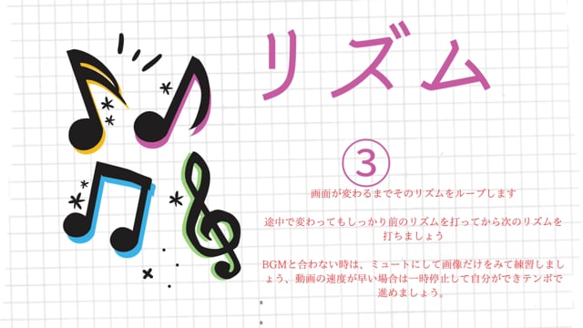 リズム③では、四分の四拍子のリズムです。画面が変わるまで同じリズムをループしてください。ループの途中で画面が変わってもそのまま最後まで前のリズムを打ちます。BGMに合わせて打てるとベストですね。😃画面が変わるのが速い場合、一時停止してしっかりリズム打をしてから次へ進んでください。慣れてくるとリズムに乗ってカッコ良い演奏ができますよ。