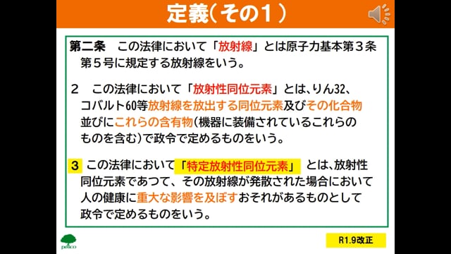 放射性同位元素等規制法の規制の概要目的定義下限数量放射線発生装置放射線業務従事者放射線施設実効線量限度・等価線量限度管理区域空気中濃度限度・表面密度限度