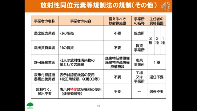 放射性同位元素等規制法の規制(許可届出使用者)放射性同位元素等規制法の規制(その他)使用の許可使用の許可(申請の記載事項)使用の許可(申請の添付書類)使用の届出(記載事項)表示付認証機器の使用をする者の届出販売及び賃貸の業の届出廃棄の業の許可欠格事項使用の許可の基準(概要)許可証記載内容